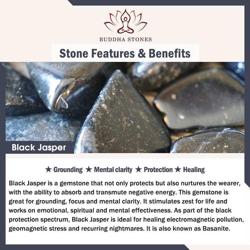 ブラックジャスパーは、身に着ける人を守るだけでなく、癒しも与える宝石です。ネガティブなエネルギーを吸収・変換する力を持つこの宝石は、グラウンディング、集中力、そして精神的な明晰さを高めるのに最適です。生きる意欲を刺激し、感情面、精神面、そして精神的な力を高めます。ブラックジャスパーは、黒の守護石として、電磁波汚染、地磁気ストレス、そして繰り返される悪夢の治癒に最適です。バサナイトとしても知られています。
