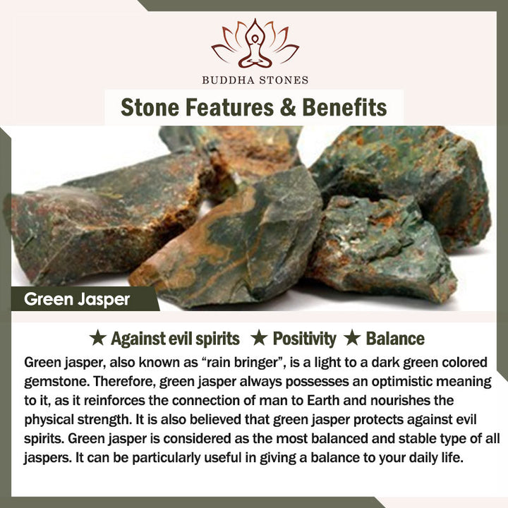 「雨をもたらす石」としても知られるグリーンジャスパーは、明るい緑色から濃い緑色の宝石です。そのため、グリーンジャスパーは常に楽観的な意味を持ち、人と大地との繋がりを強め、体力を養うとされています。また、グリーンジャスパーは邪悪な霊から身を守るとも信じられています。グリーンジャスパーは、すべてのジャスパーの中で最もバランスが取れ、安定した石と考えられています。特に、日々の生活にバランスをもたらすのに役立ちます。