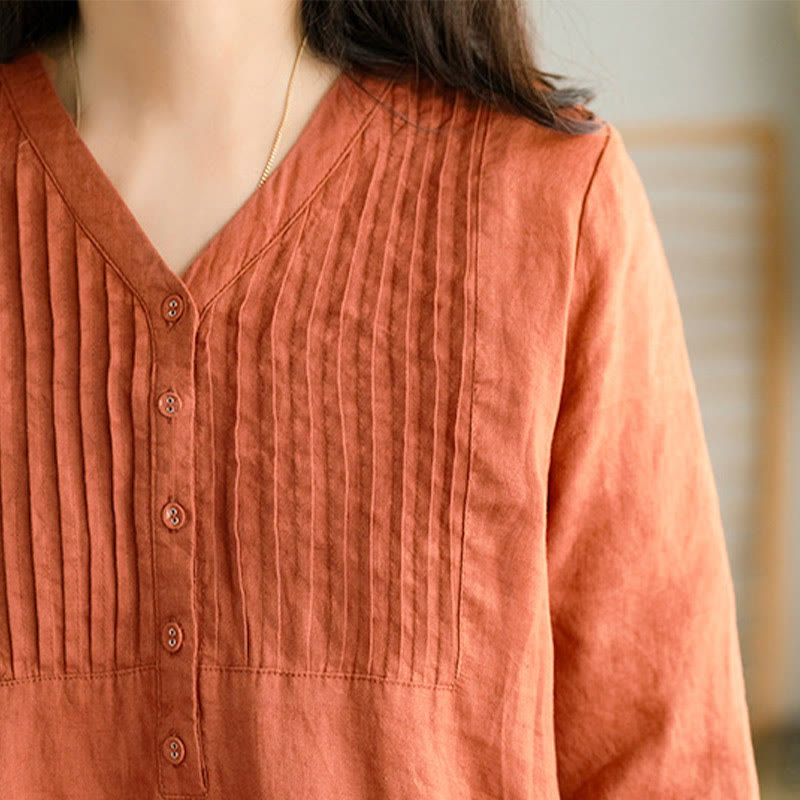 Buddha Stonesカジュアル 無地 アコーディオンプリーツ Vネック ハーフスリーブデザイン ミディドレス ポケット付き