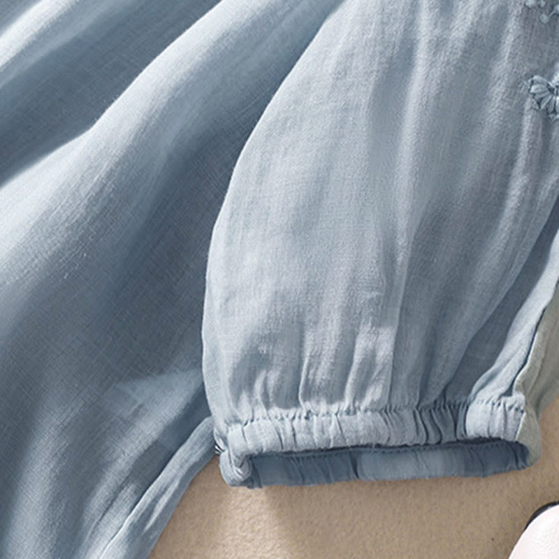 Buddha Stonesカジュアル 無地 ボタン 花柄 刺繍デザイン パフ 半袖 レディース シャツ - ライトブルー - US8-10,UK/AU12-14,EU40-42 (2XL) - image 0
