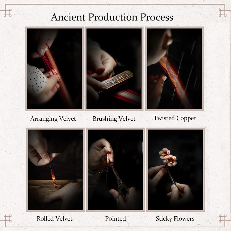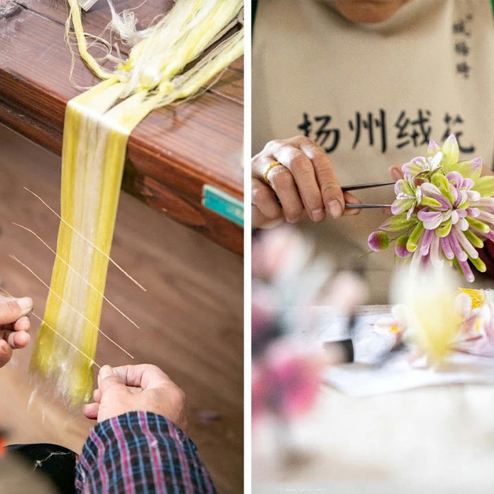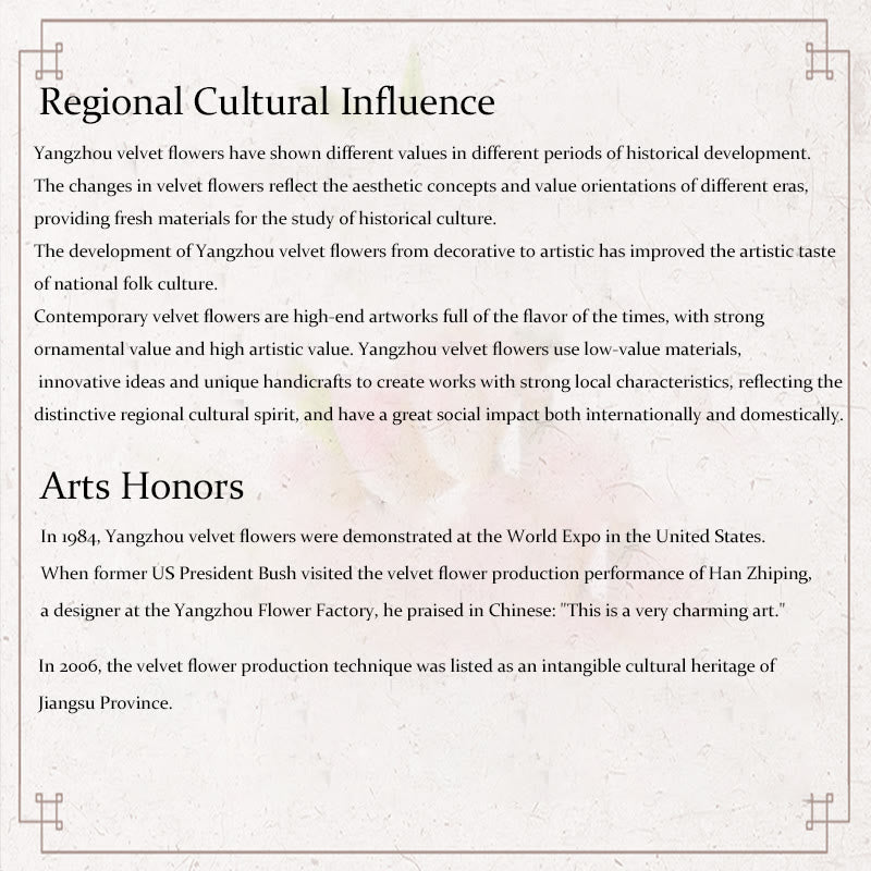• 文化遺産の保存:伝統的なベルベットフラワーの工芸技術を用いることで、文化遺産と職人技の保存の重要性が強調されます。これは、特に揚州のような地域で世代を超えて受け継がれてきた精緻な技法をはじめとする、手仕事の美しさを際立たせています。