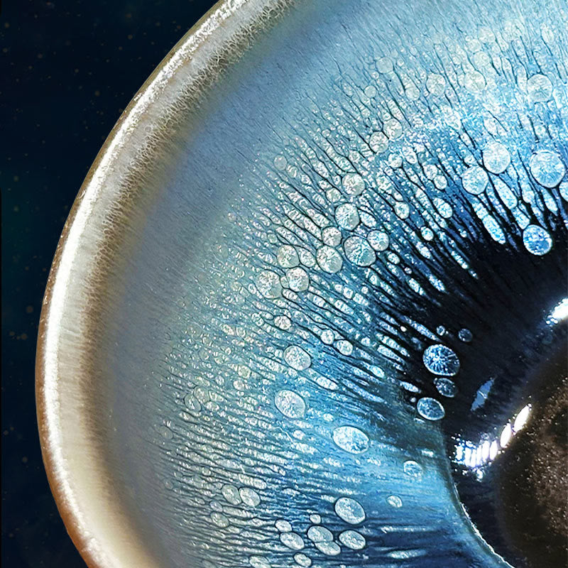これらのカップは、色鮮やかな「特殊効果」を放つ、濃く厚い釉薬で愛されています。これらの特殊な模様は、高温焼成によって釉薬が結晶化し、美しい模様を描き出すことで実現されます。縞模様、羽根模様、油染みなどが現れることがあります。