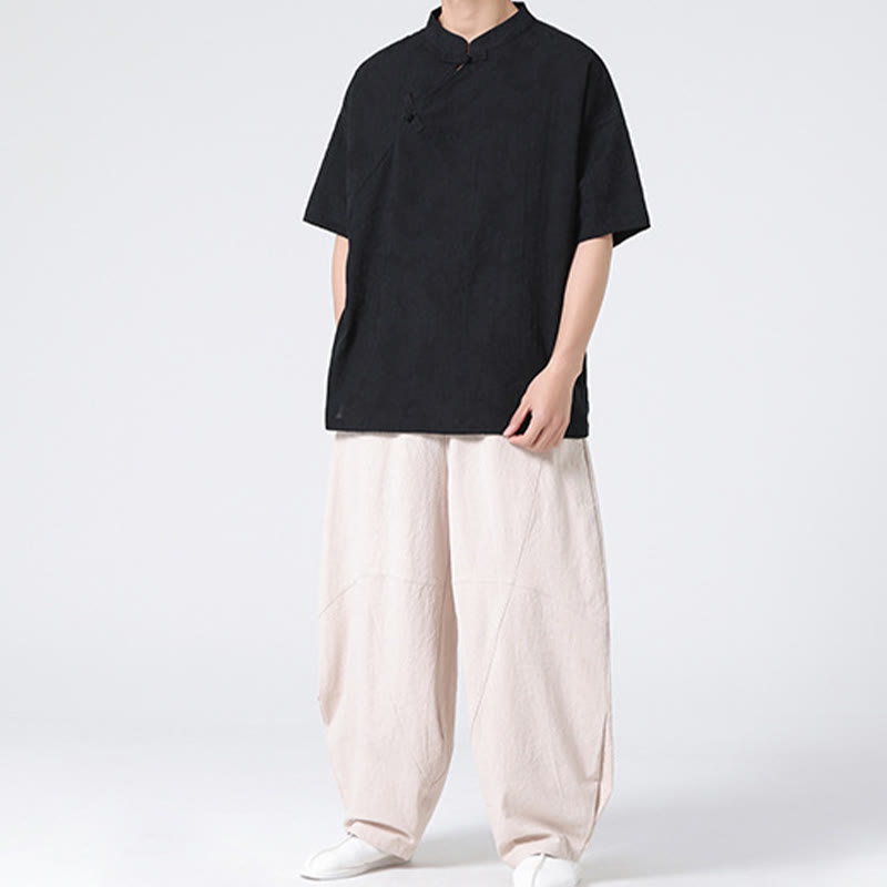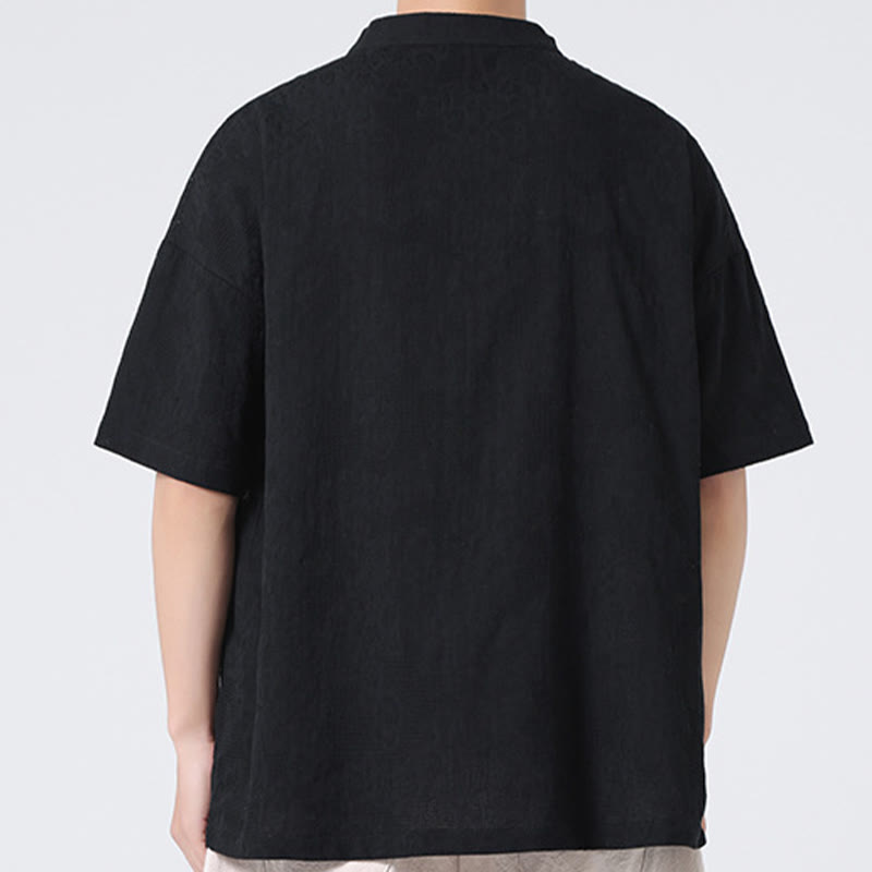Buddha Stonesレトロ 純色 カエルボタンデザイン ジャカード 花柄 メンズ 半袖 コットンリネン シャツ - image 1