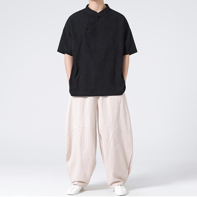 Buddha Stonesレトロ 純色 カエルボタンデザイン ジャカード 花柄 メンズ 半袖 コットンリネン シャツ