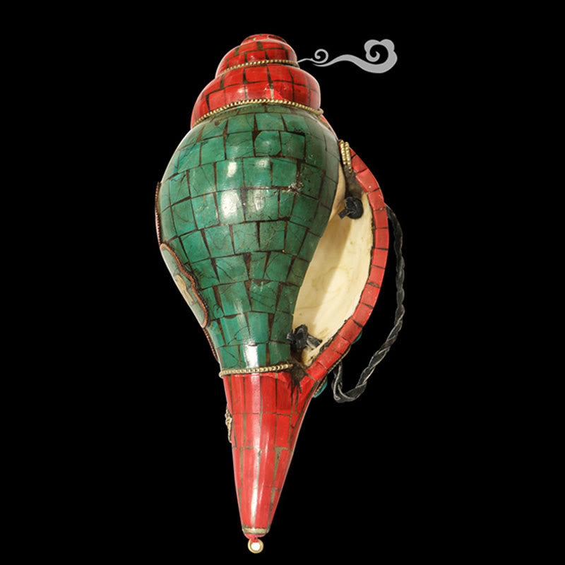 シャンカは仏教の八大吉祥シンボルの一つであり、仏教の遍満的な音を象徴しています。名声、長寿、豊かさ、幸運をもたらし、邪気を払い、周囲を浄化すると信じられている縁起の良いシンボルです。右旋回する白い法螺貝(チベット語:དུང་གྱས་འཁྱིལ、ワイリー語:dung gyas 'khyil)は、仏教の優雅で深遠、旋律的で、互いに浸透し、遍満的な音を象徴しています。シャンカの音は、神聖なオーム音を象徴しています。