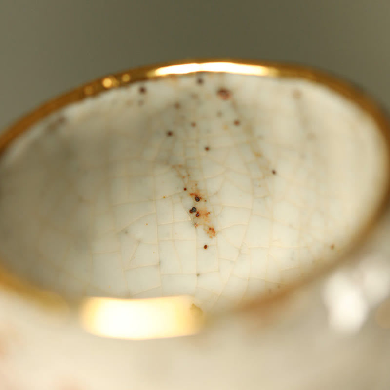 この手造り志野焼の湯呑みは、金色に輝くアロワナの彫刻が施され、湯呑みの輪郭と層を際立たせています。陶器の魚の鱗が湯呑み全体に広がり、優雅さと素朴な趣が融合しています。志野焼の滑らかな釉は、手仕事による温かみと美しさを感じさせます。均一に散りばめられた不規則なひび割れ模様は、重なり合い織り交ぜられ、釉薬の深みを増すとともに、使い手に「育てる」喜びを与えてくれます。作者はまだ作品の90%しか完成しておらず、残りの10%は使い手が自分だけの個性を吹き込むために残されています。シンプルでありながら優雅なこの個性的な湯呑みは、一つ一つが独特の彫刻の崖のような質感を帯びており、使い込むごとに様々な表情を見せ、茶通に驚きを与えてくれます。