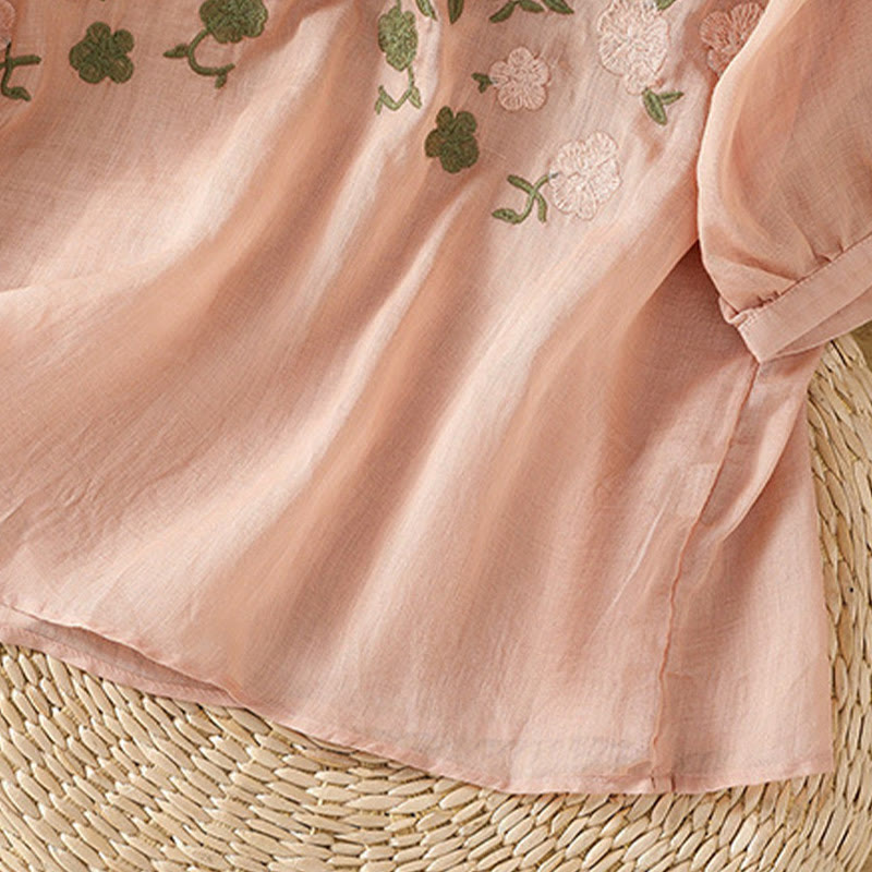 Buddha Stonesカジュアル レディース 花 緑の葉 刺繍柄 Vネックデザイン 半袖 コットンリネンシャツ - ピンク - US8-10,UK/AU12-14,EU40-42 (2XL) - image 0