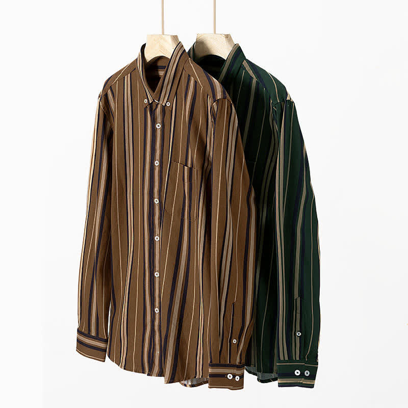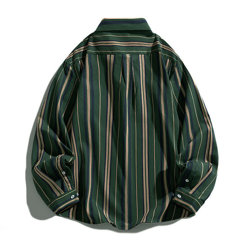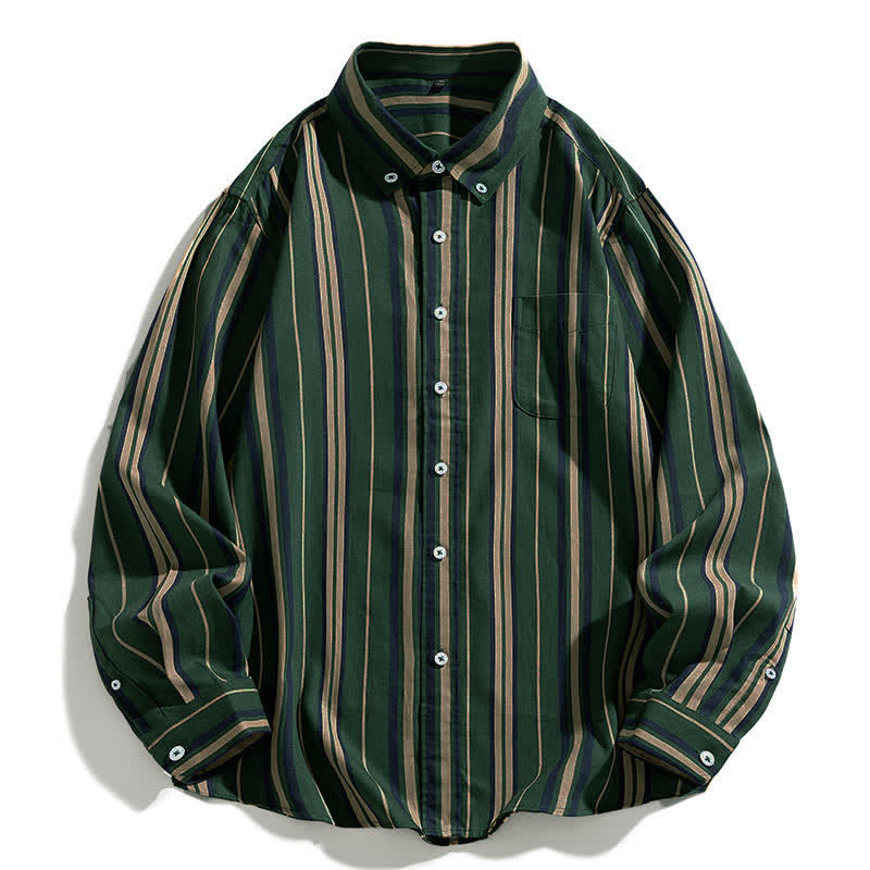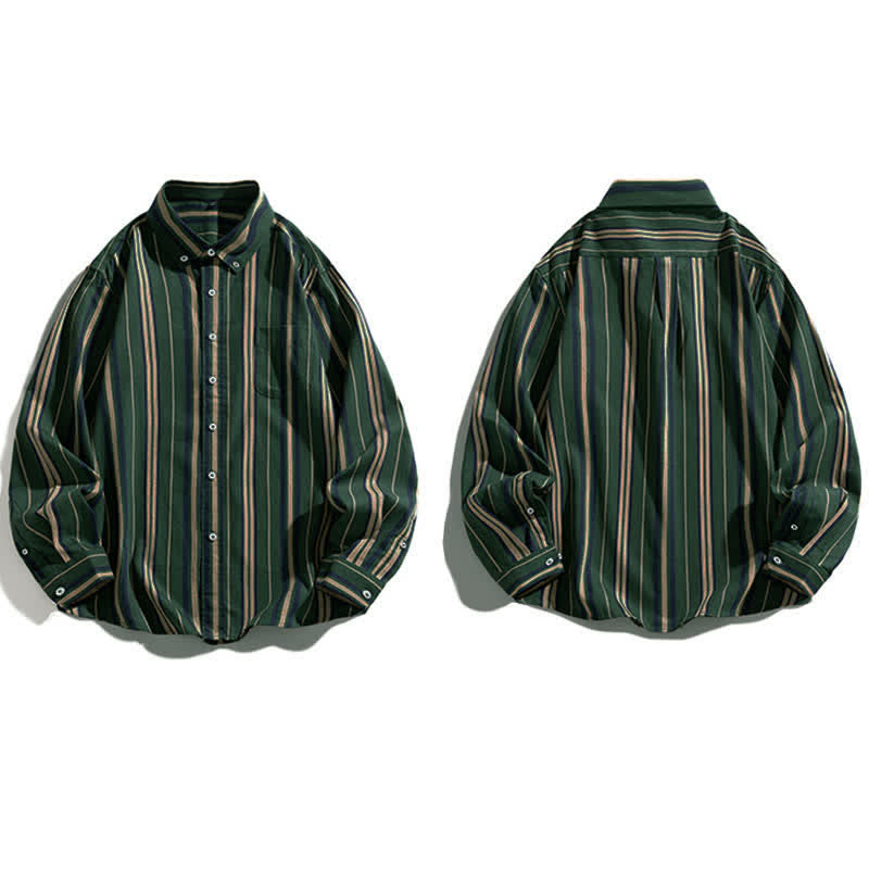 Buddha Stones レトロなカラーブロックストライプの長袖ボタンメンズコットンシャツ(ポケット付き) - image 1