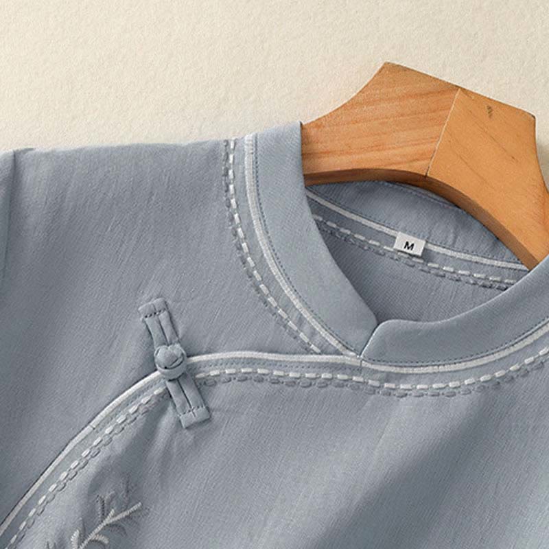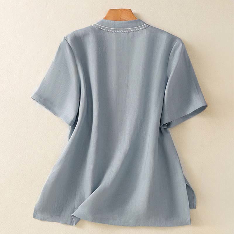 Buddha Stones 夏 スタンドカラー 半袖 無地 レディース フロッグボタン コットンシャツ ポケット付き - image 1