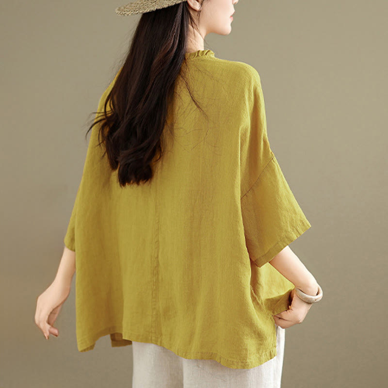 Buddha Stones 春のVネックフロッグボタン長袖無地レディースコットンシャツ - image 9
