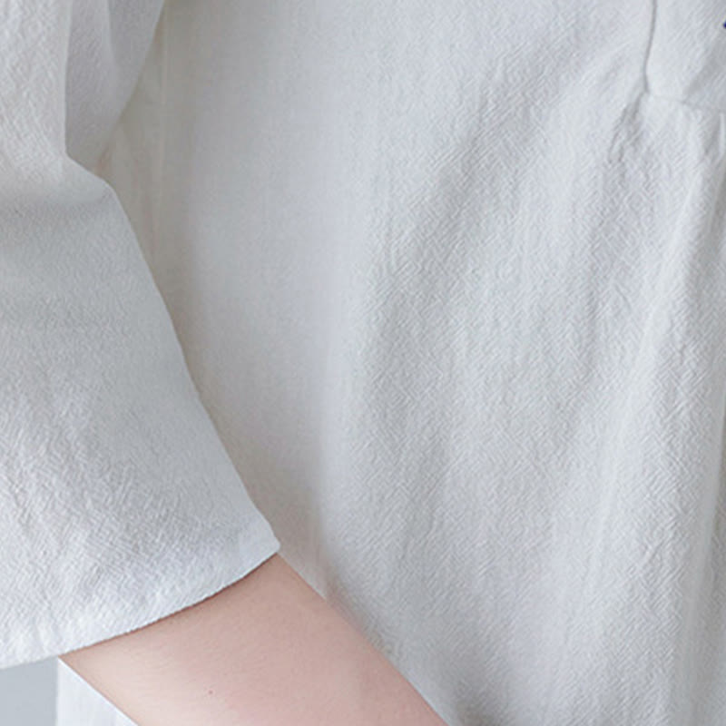 Buddha Stonesカジュアル ボヘミア 刺繍 花柄 シンプルデザイン 七分袖 Vネック コットンリネン マキシドレス