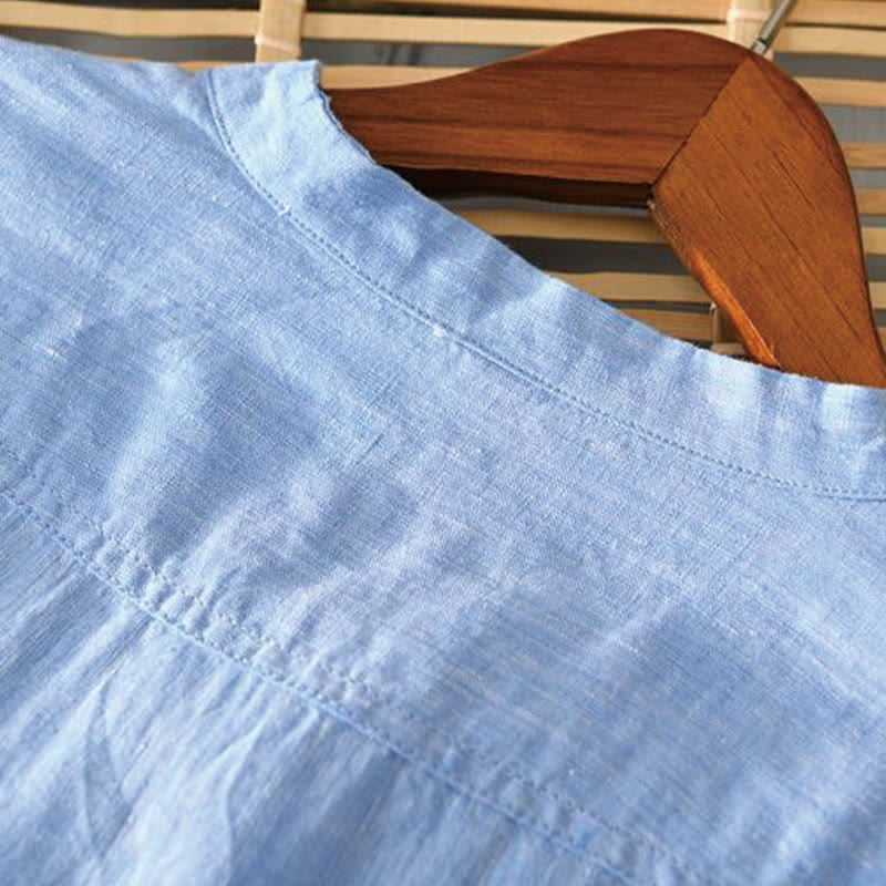 Buddha Stonesデイリー 無地 スタンドカラー 半袖 リネン ハーフボタン メンズシャツ
