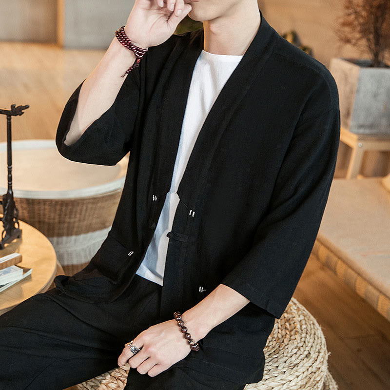 Buddha Stones無地中国風カエルボタンジャケット コットンリネン メンズ 七分袖着物 - image 1
