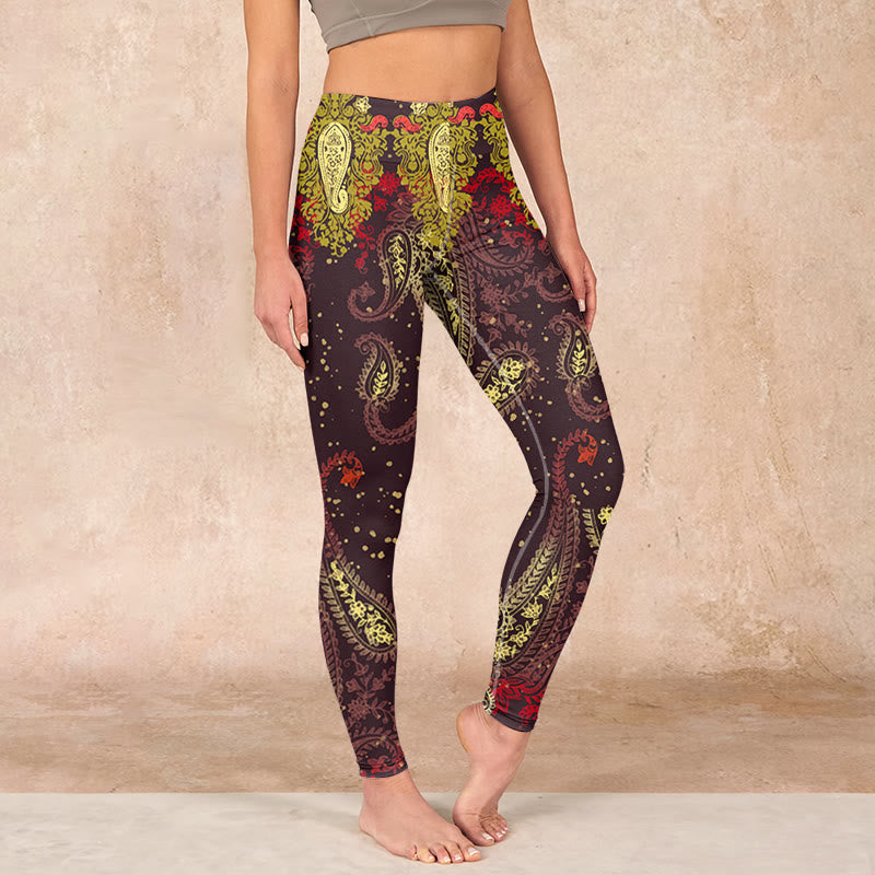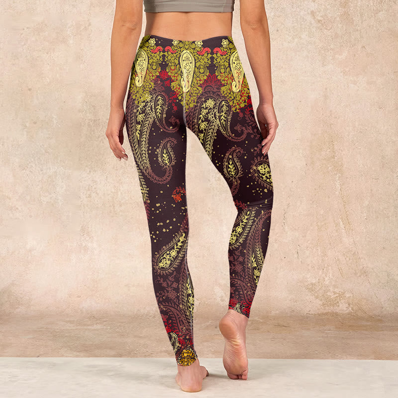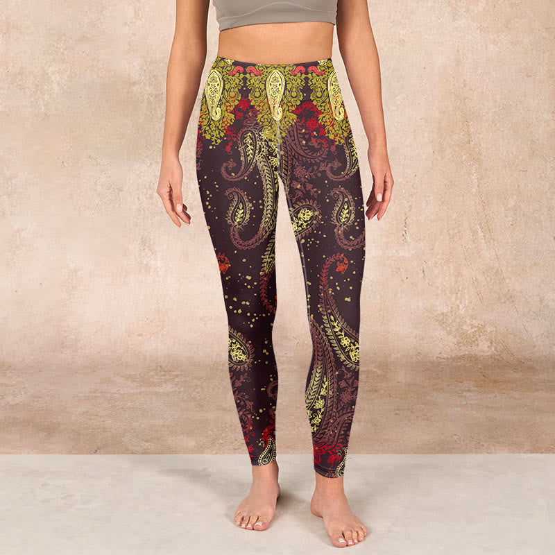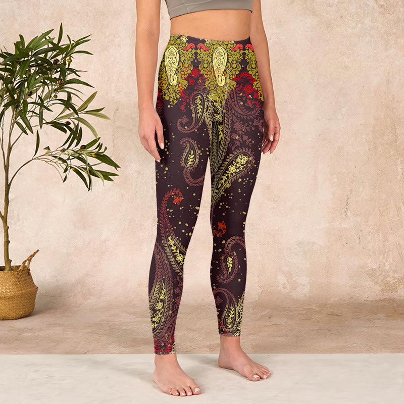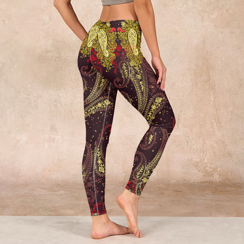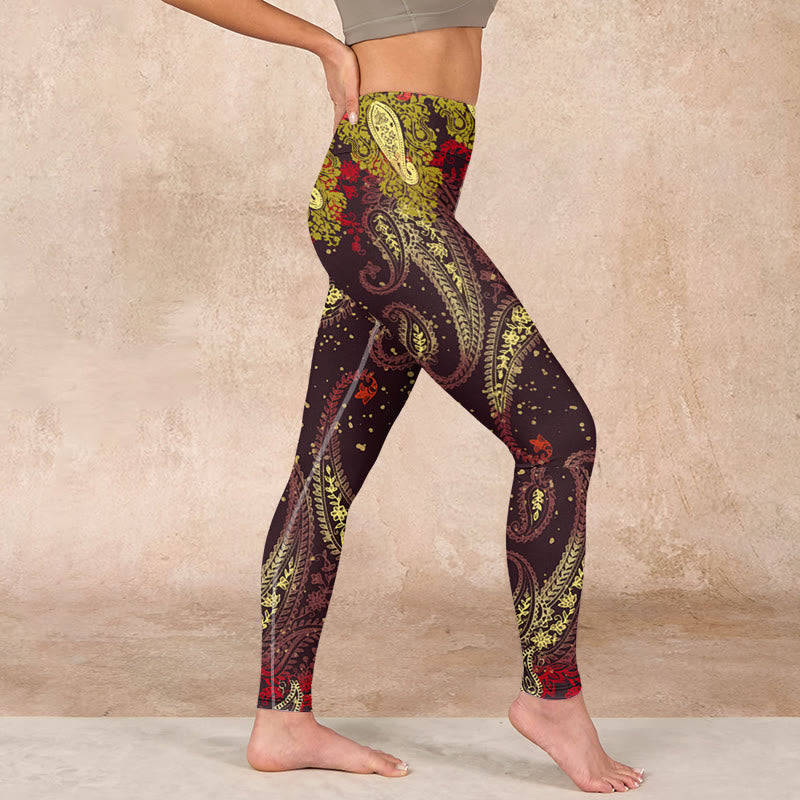 デザインインスピレーション:レギンスは、深みのある赤褐色の背景にカシューナッツの花のつるをあしらったデザインで、温かさとエキゾチックな美しさを象徴しています。アースカラーは自然との繋がりを、繊細な花柄は成長と活力を感じさせ、熱帯植物の魅力を称えています。