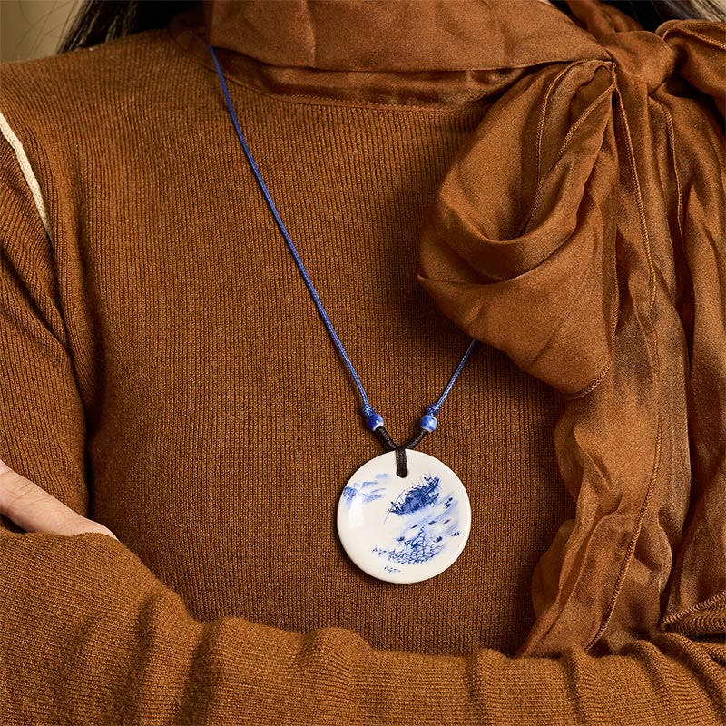 Buddha Stonesエスニック 牡丹 桃の花 蓮のシンボル 陶器 ネックレス 悟りのペンダント - 村の風景 - image 12