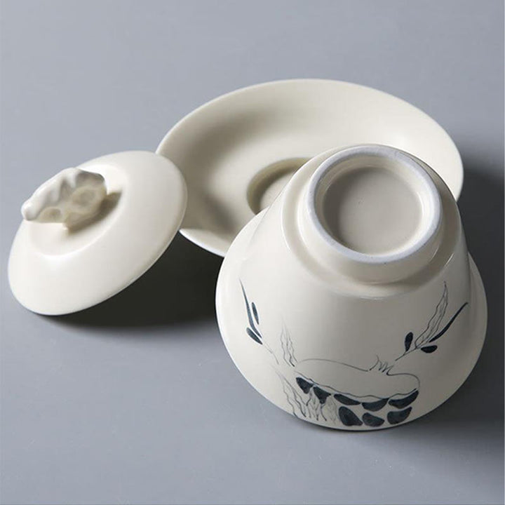 手描きのザクロ、ハイビスカス、松、蓮の陶器製蓋碗三彩ティーカップ、カンフーティーカップとソーサー、蓋付き