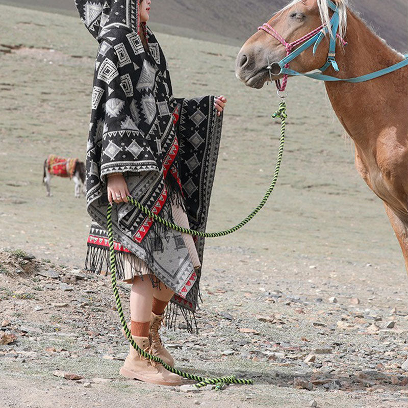 精緻な三角形の模様があしらわれたフード付きクロークで、チベット伝統の職人技と現代的な快適さが融合した逸品をぜひご堪能ください。この冬に心地よく羽織れるトラベルスカーフは、暖かさだけでなく、フードが特徴的なユニークなスタイルを演出し、多用途性と防寒性を高めます。文化遺産と機能的なエレガンスの融合を求める方にぴったりのアイテムです。冬の旅にぴったりの、暖かくスタイリッシュな一枚として、また普段の装いに個性的なアクセントを添えるアイテムとして、きっとご満足いただけます。💕