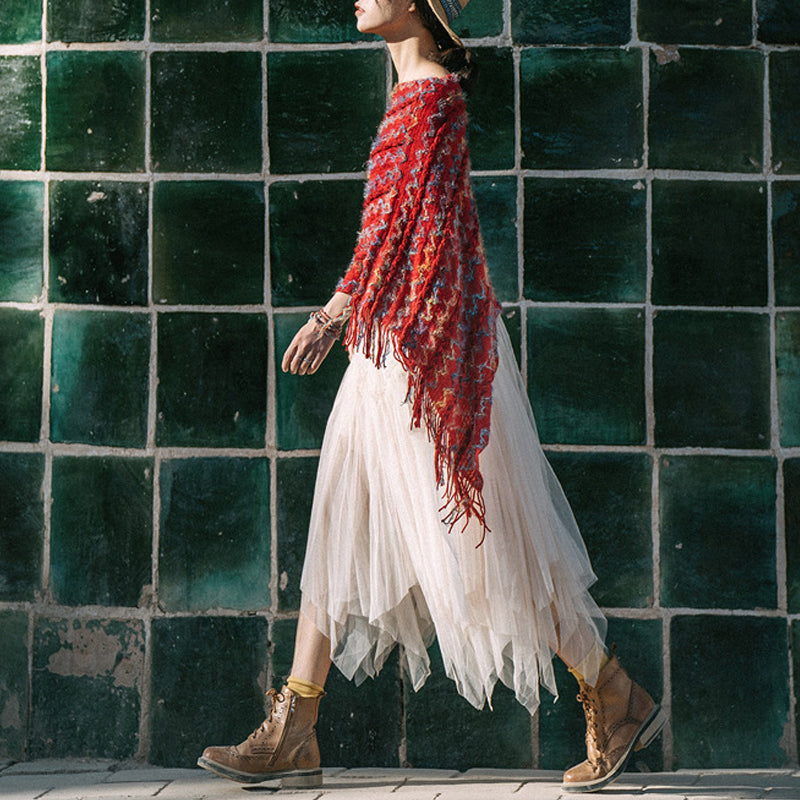Buddha Stonesチベット カラフル ストライプ ショール タッセル プルオーバー 冬 快適 旅行用 スカーフ ラップ - レッド 85×75cm - image 0