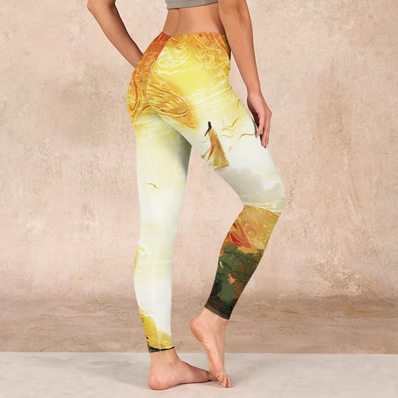 Buddha Stones ミントグリーン マウンテンクレーンプリント ライクラ生地 フィットネスレギンス レディース ヨガパンツ レギンス BS 1