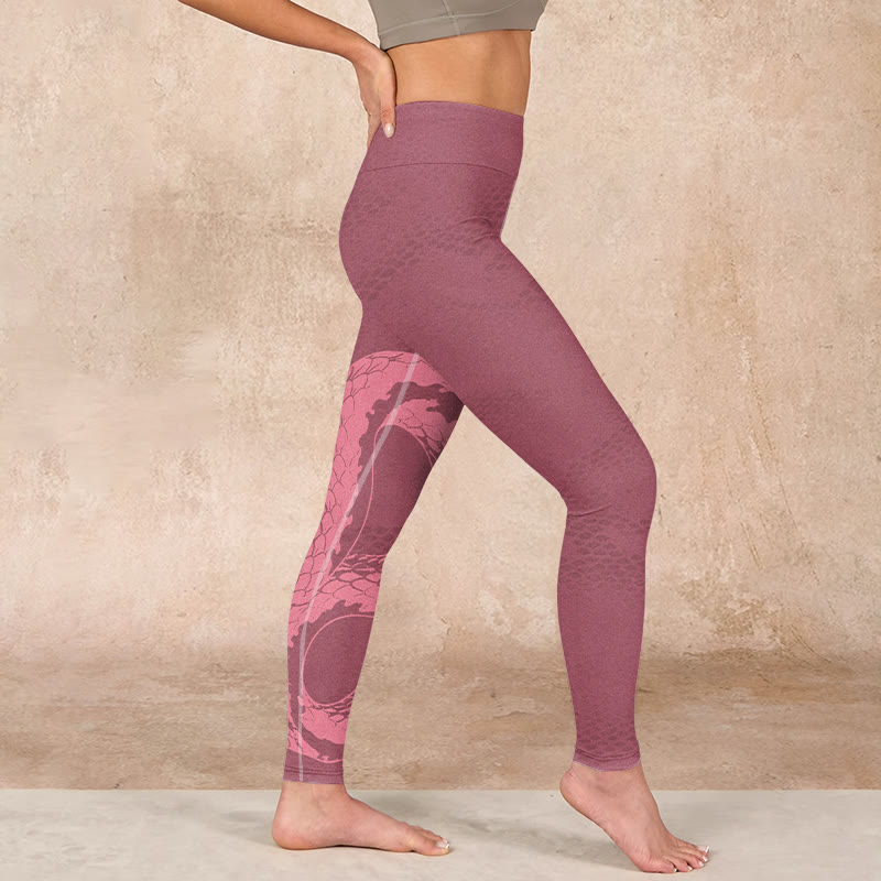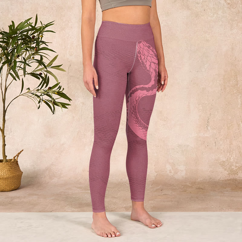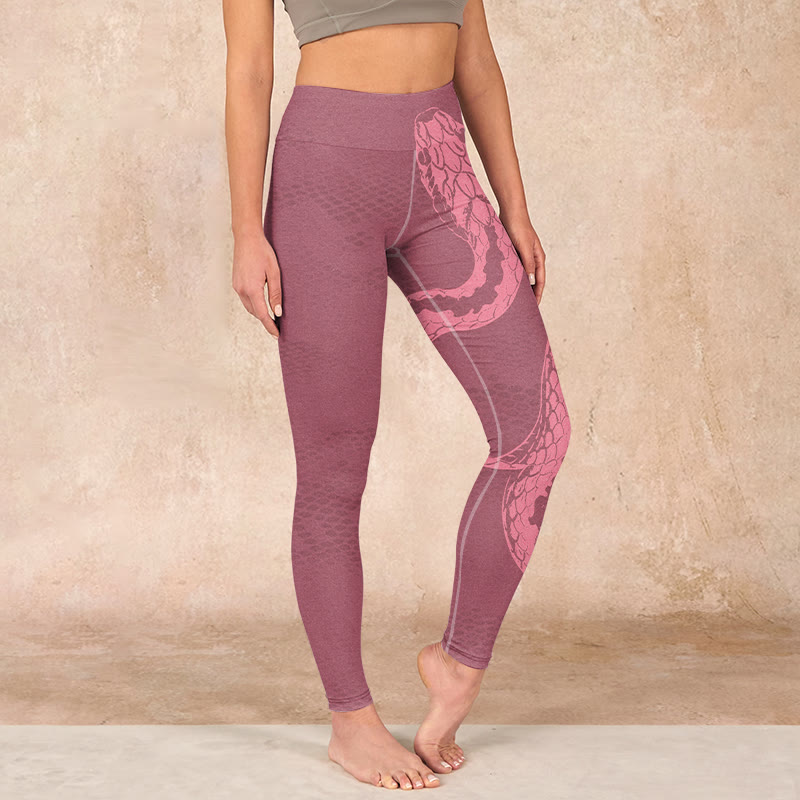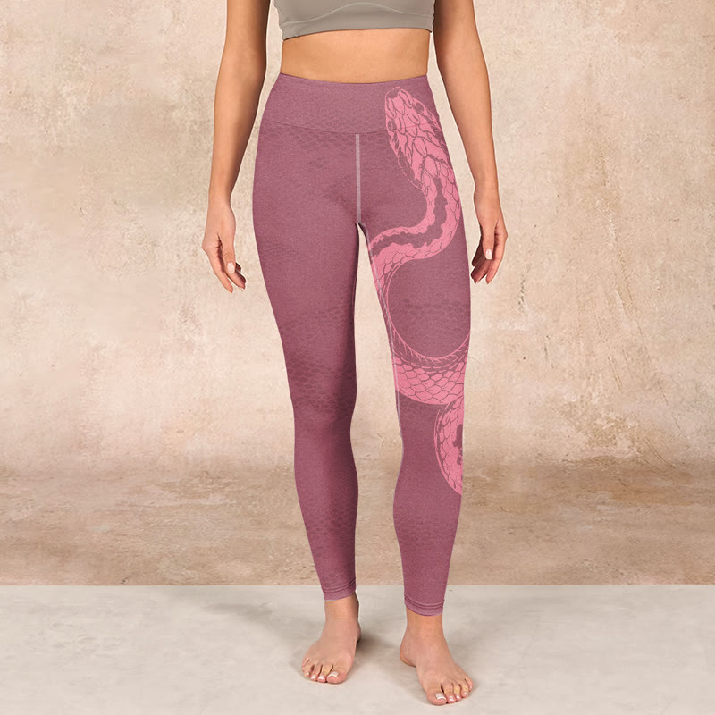 デザインのインスピレーション:このレギンスは、変容と再生を象徴するピンクのヘビとヘビ皮の模様が特徴で、複雑な質感は強さと回復力を表し、優雅さと適応性を反映したレギンスとなっています。