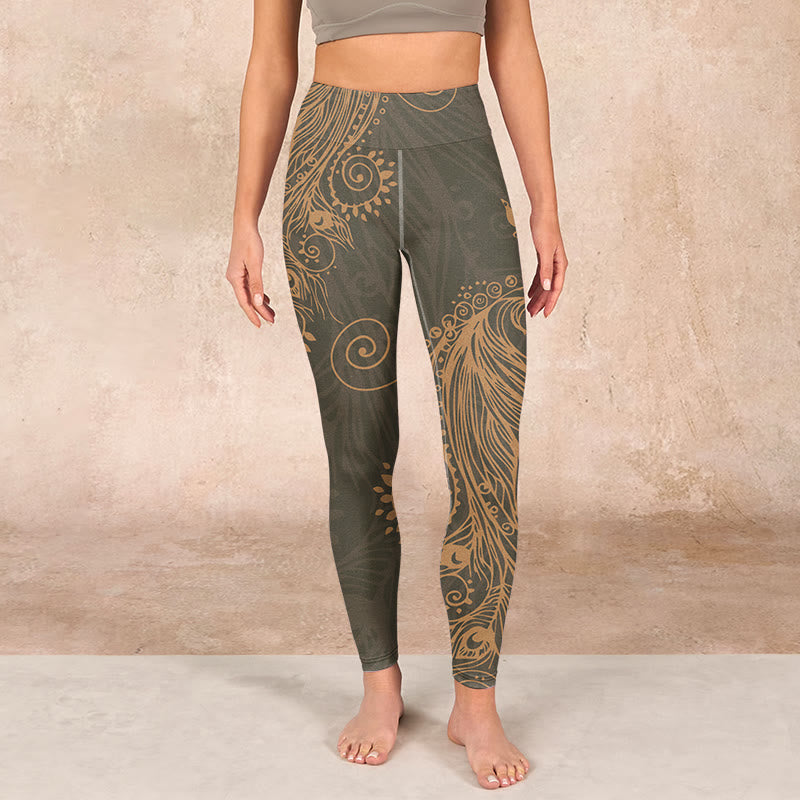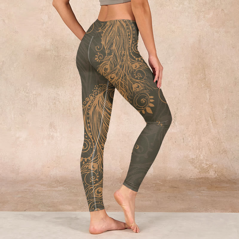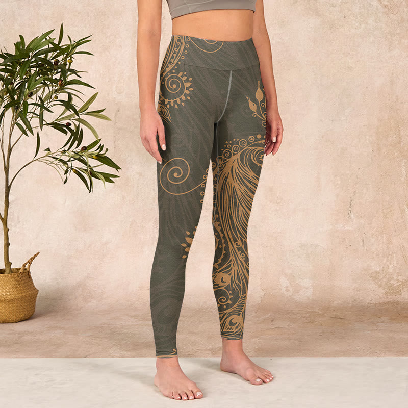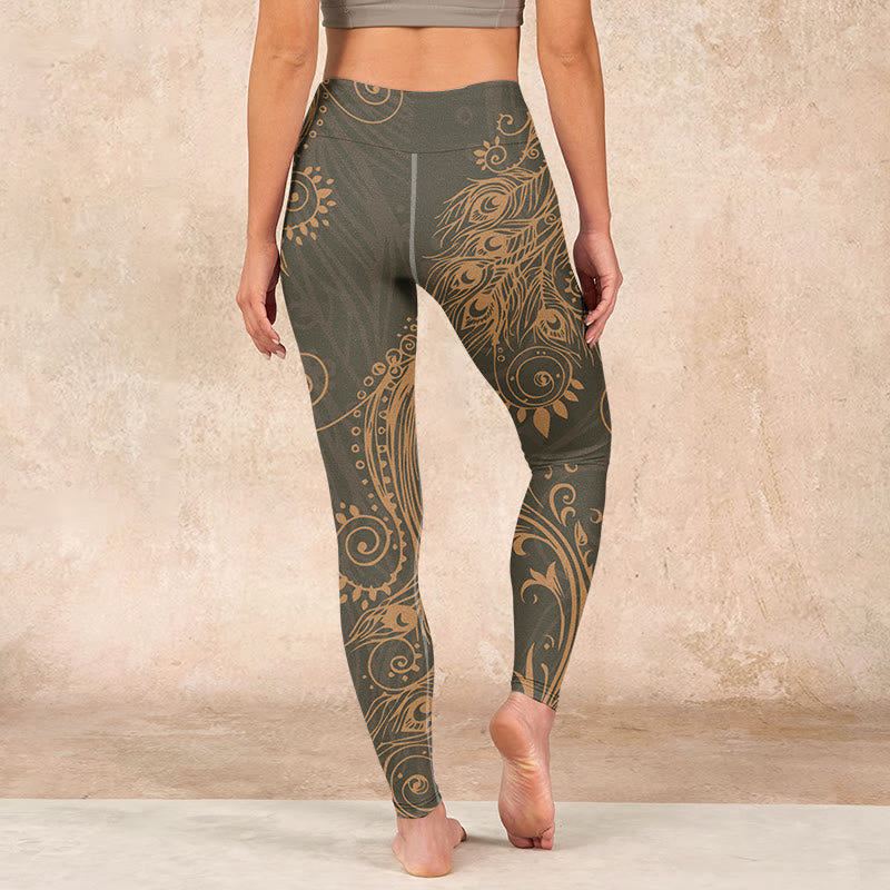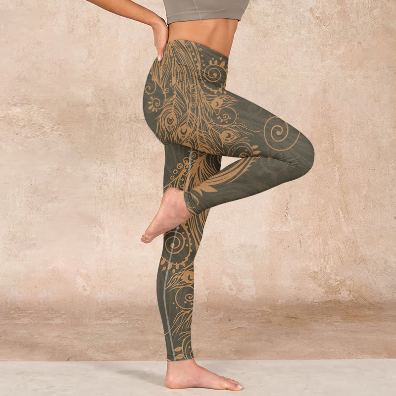 デザインインスピレーション:このレギンスは、孔雀の羽根をモチーフにした、複雑で渦巻くような美しいデザインが特徴です。優美な曲線と繊細なラインが、流れるような躍動感を演出し、衣服全体のエレガンスを高めています。精巧な羽根と華やかな渦巻き模様が組み合わさることで、洗練された自然をモチーフにした美しさがレギンスに生まれ、デザインに深みと動きを与えています。