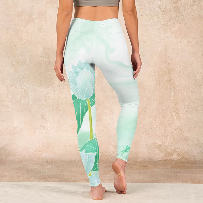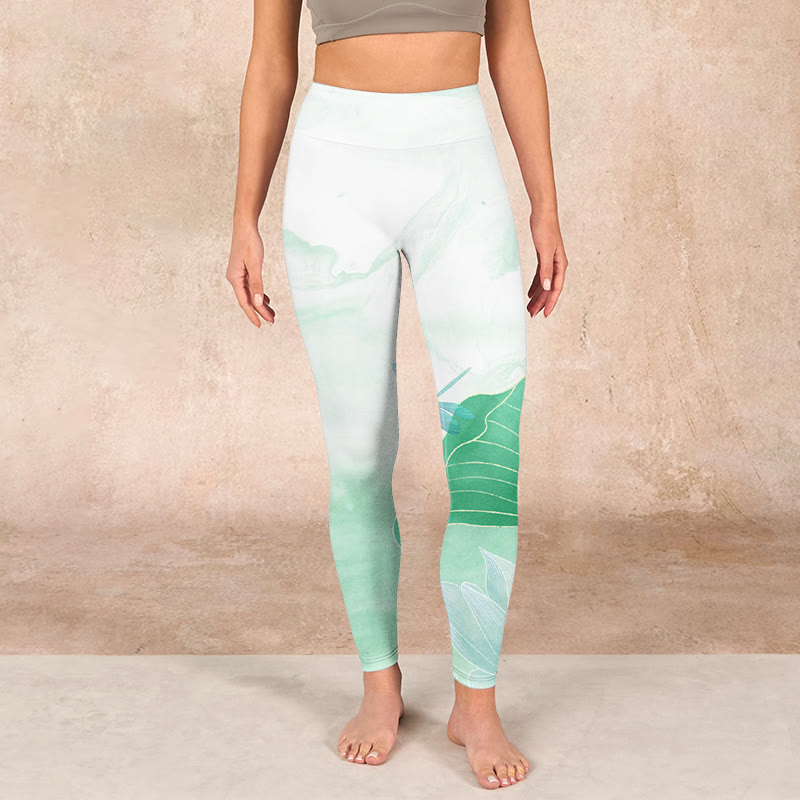 - デザインインスピレーション:ミントグリーンの蓮の葉とトンボをあしらったレギンス。純粋さ、再生、そして変容を象徴しています。蓮の葉は回復力と困難を乗り越える力を、トンボは変化と順応性を象徴し、成長の美しさと人生の旅路を称える調和のとれた模様を生み出しています。
