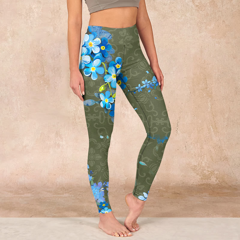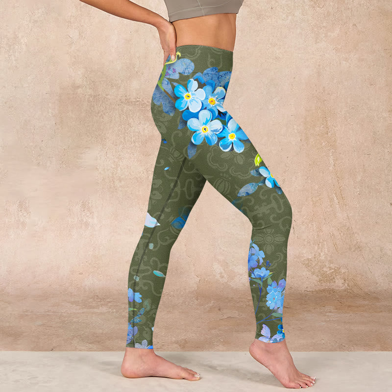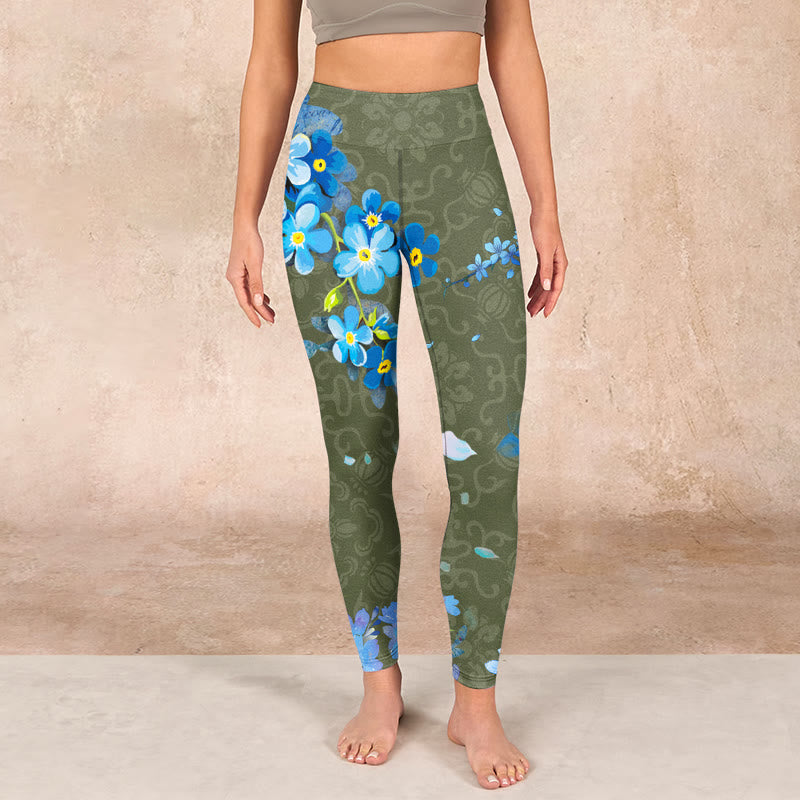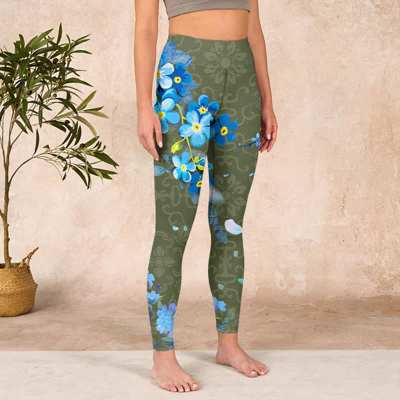 デザインインスピレーション:レギンスには、静けさ、愛、そして変容を象徴する青い花と蝶のデザインが施されています。青い花は平和と静けさを、蝶は希望と変化の美しさを象徴し、自然と個人の成長の調和のとれたつながりを祝福しています。