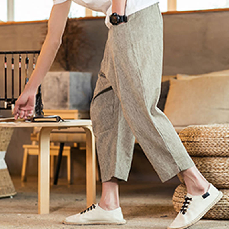 Buddha Stonesカジュアル 無地 ドローストリング メンズ 伸縮性ウエストバンド コットンリネン パンツ ポケット付き - image 1