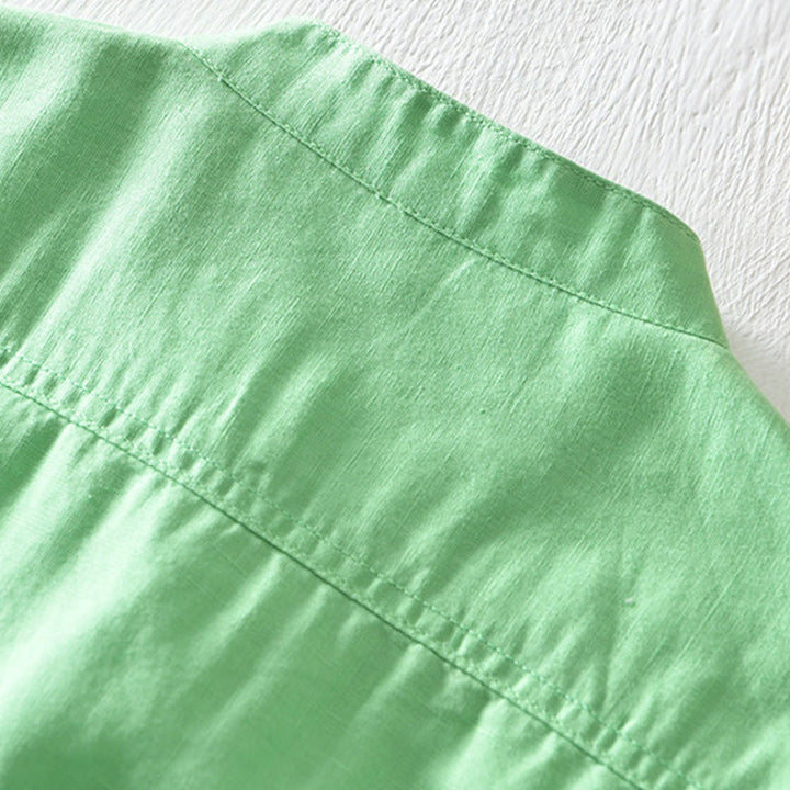 Buddha Stones無地ハーフボタンデザインスタンドカラーメンズ半袖コットンリネンシャツ - image 2
