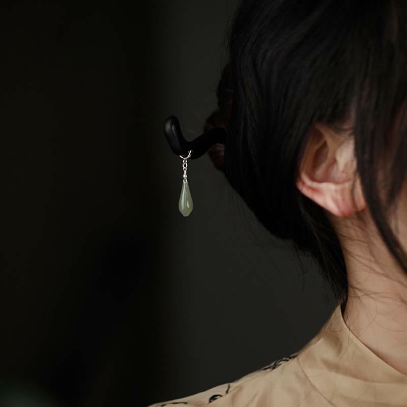 Buddha Stones925スターリングシルバー天然和田翡翠黒檀木製幸運チャームヘアピン
