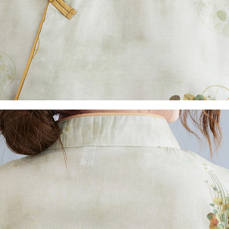 Buddha Stones、花、緑、黄色の葉のプリントのチャイナドレス(ミディ丈)七分袖、ポケット付き - image 9