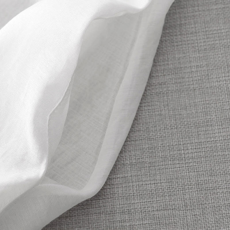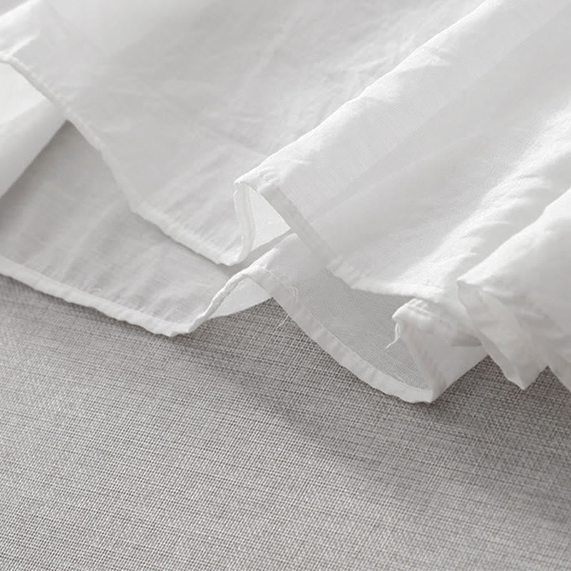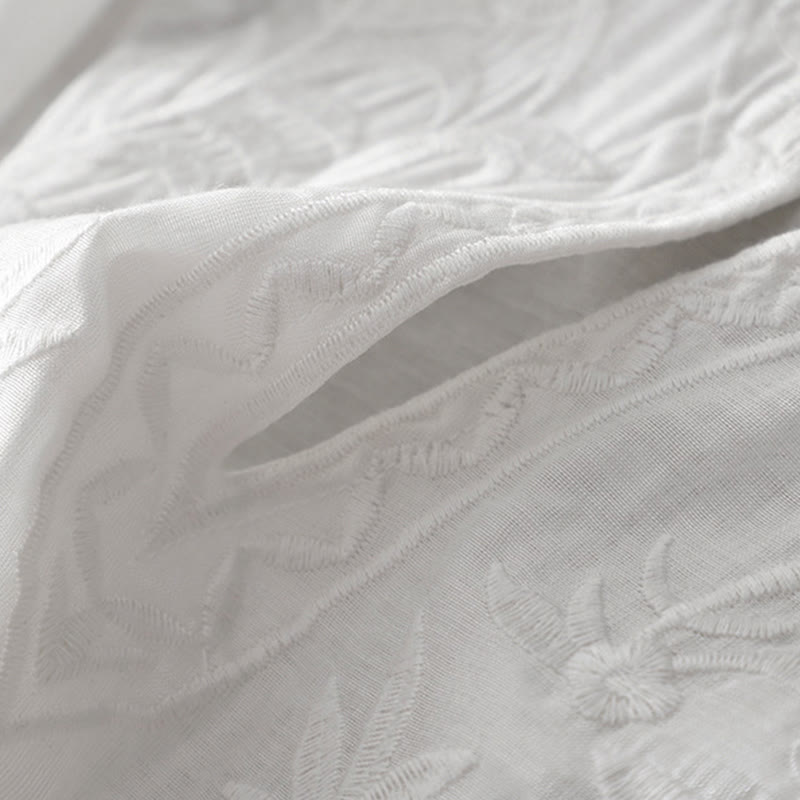 Buddha Stones夏 ホワイト ピュアカラー 刺繍 リーフ フラワー Vネック 半袖 ミディドレス ポケット付き