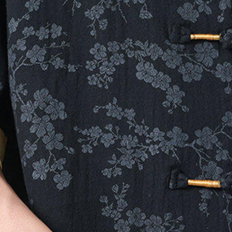 Buddha Stones夏 桃の花柄 中国風 カエルボタン コットンリネン 半袖 メンズシャツ - 黒 - US/UK/AU46、 EU56 (5XL) - image 0