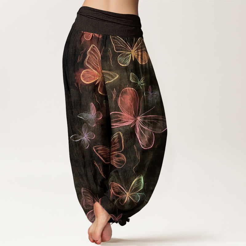 • デザイン:変容を象徴する蝶のモチーフをあしらったハーレムパンツ。繊細なラインで蝶の姿と羽根の模様を表現し、半透明の羽根は軽やかさと俊敏さを表現しています。様々なポーズで描かれた蝶は、躍動感あふれる飛翔を予感させます。深い意味と美しさを兼ね備えたデザインです。