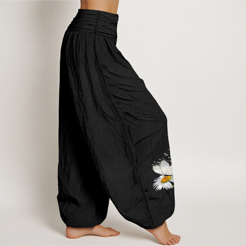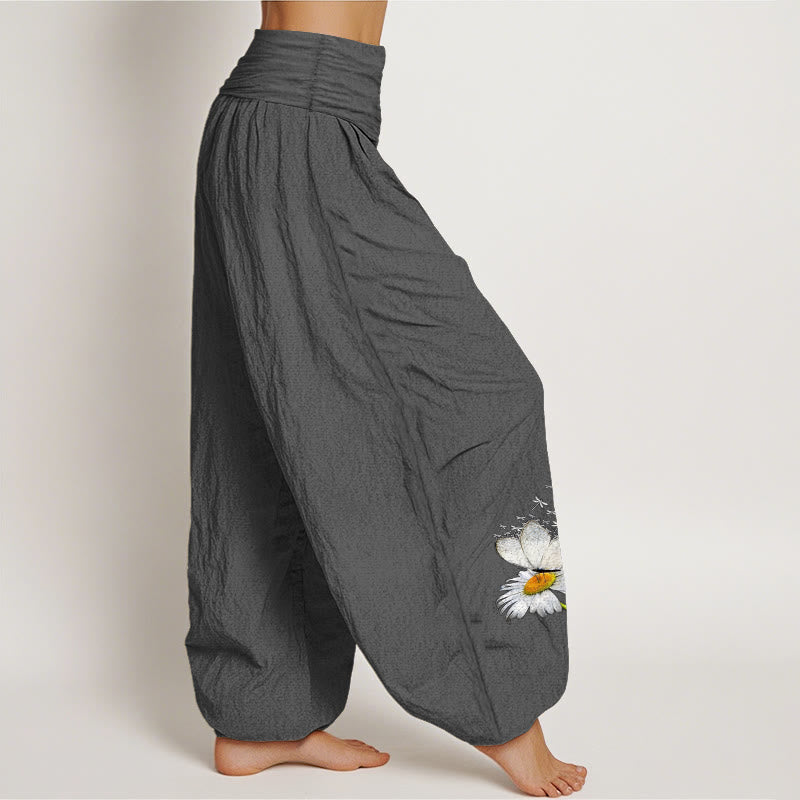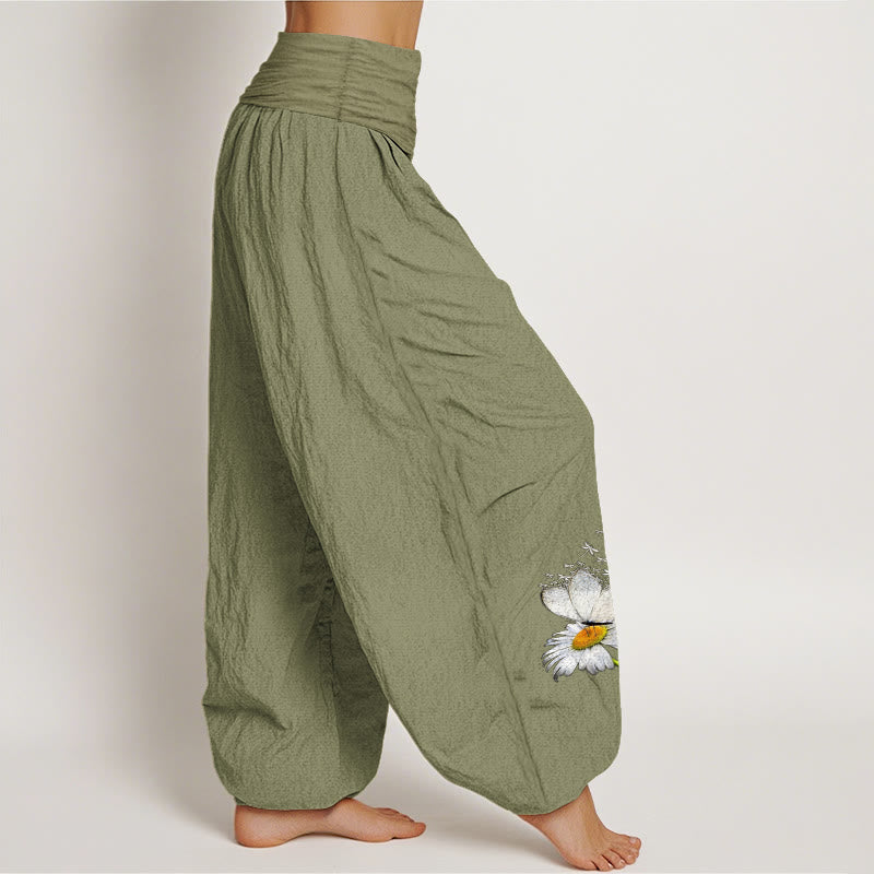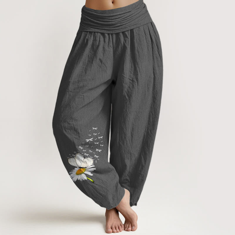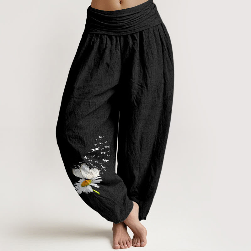 Buddha Stones ピュアコットン エレガント デイジー バタフライ トンボ柄 レディース 伸縮性ウエスト ハーレムパンツ - image 1
