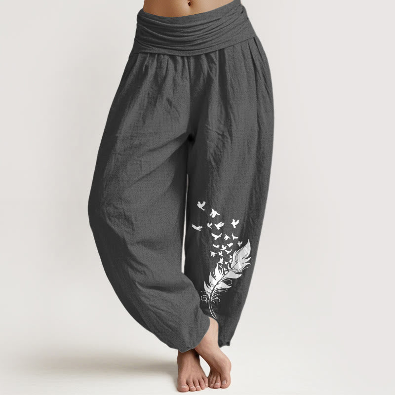 Buddha Stones ピュアコットン 鮮やかな鳥の羽根柄 レディース 伸縮性ウエスト ハーレムパンツ - image 1